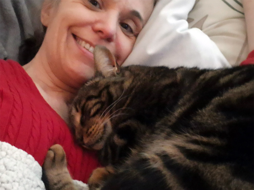 Het gaat ontzettend goed met hem. Hij is lief, zachtaardig en dol op mensen — hij lijkt werkelijk nergens bang voor. Knuffelen is zijn grootste hobby en ’s nachts ligt hij het liefst strak tegen me aan op bed. Soms moet ik me in de meest onmogelijke bochten wringen om eruit te komen zonder hem wakker te maken. Maar vergis je niet: hij is ook een echte vechter. Door een voedselallergie en een beginnende nierstoornis heeft hij zijn eigen uitdagingen, maar hij slaat zich er dapper doorheen.