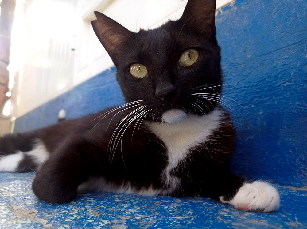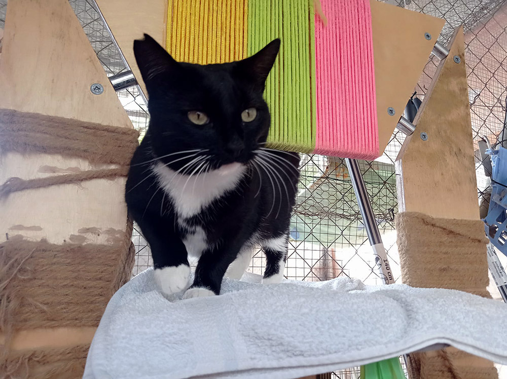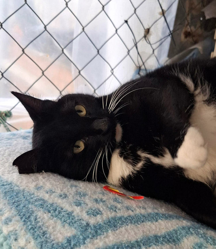 Eenmaal in het asiel past ze zich heel snel aan. Door haar leven op straat, en waarschijnlijk voornamelijk onder auto’s, zit haar vacht onder het vuil en vet. Ze laat rustig toe dat de ergste plekken schoongemaakt worden en de laatste resten vuil wast ze zelf met voortvarendheid weg. Na een paar weken in het asiel is ze ook weer een beetje aangekomen, niet in de laatste plaats omdat ze ieder schoteltje natvoer en bakje met brokken met smaak verorbert.