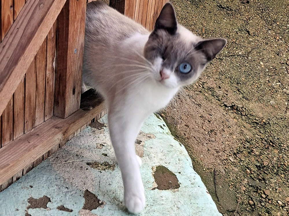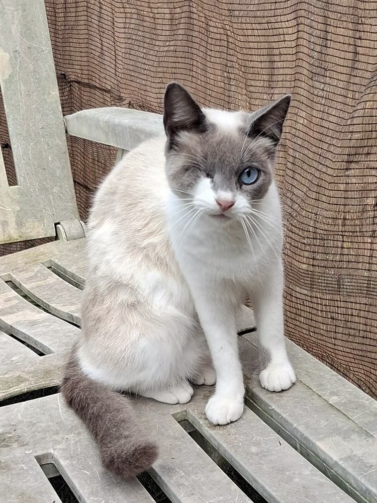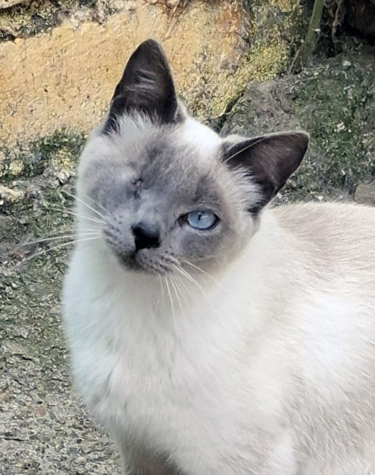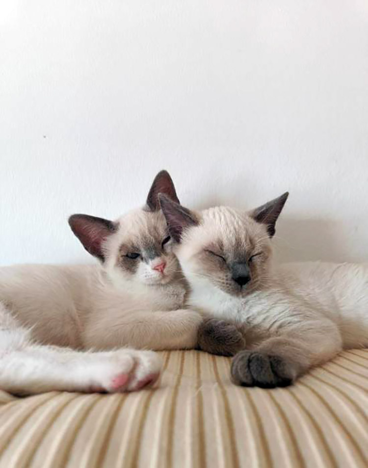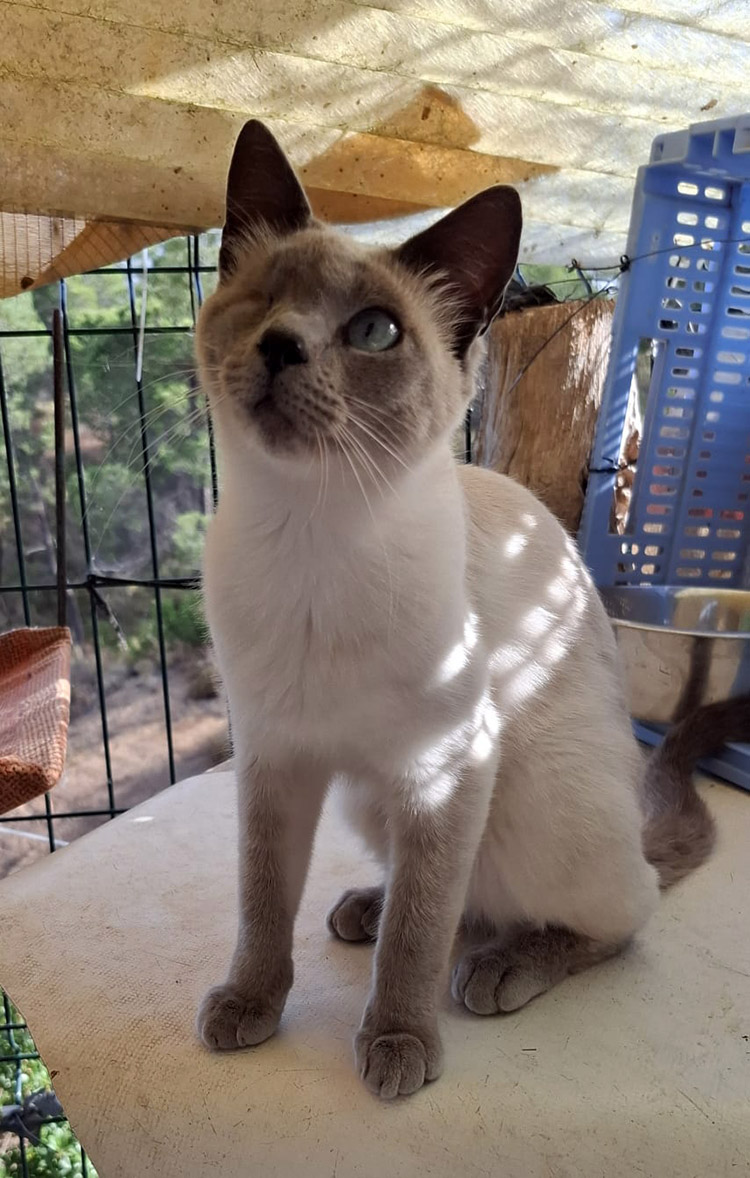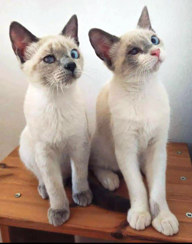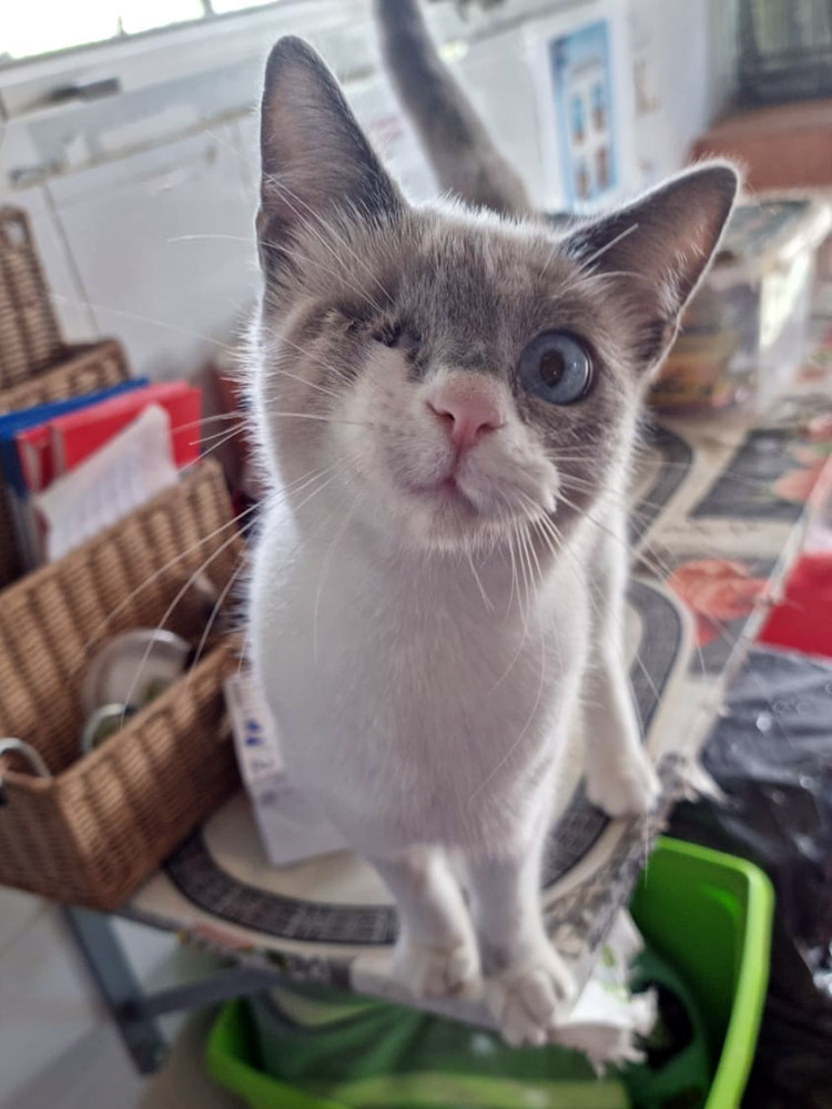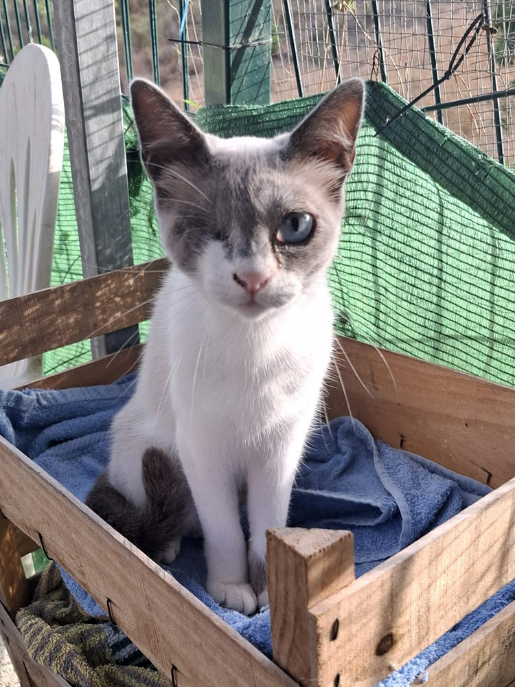 Ze waren amper een maand oud toen ze gevonden werden in een gecontroleerde kattenkolonie. Alles wees erop dat ze gedumpt waren. Ze waren in een heel slechte conditie en hun beide ogen waren geïnfecteerd. Een jonge vrouw nam hen tijdelijk in huis om ze een kans te geven. Vanaf dat allereerste moment kregen ze alle veterinaire zorg die ze nodig hadden en begonnen ze aan een intensieve behandeling die maanden duurde. De klok rond werden hun oogjes gedruppeld en gezalfd. Hun linkeroog herstelde volledig, maar het rechteroog verslechterde steeds meer tot er nog maar een optie overbleef: het oog verwijderen en de wond sluiten. De zusjes herstelden volledig van deze ingreep en konden normaal en pijnvrij verder leven.