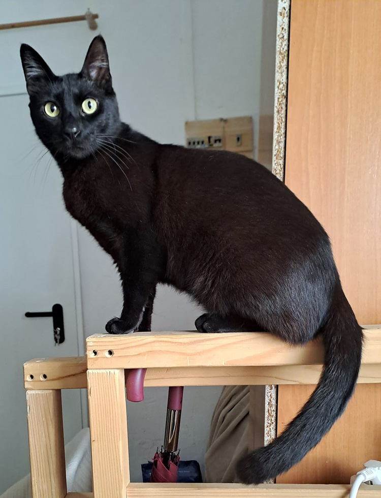 Jet woont zijn al hele leven binnen bij Nora (in één kamer) maar hij is wel een actieve kat en is lekker speels. Nora denkt daarom dat hij blij zal zijn als hij na een tijdje naar buiten kan. Een veilige tuin of afgeschermd balkon is ideaal maar in een veilige en verkeersluwe buurt zal hij na gewenning ook wel naar buiten kunnen.