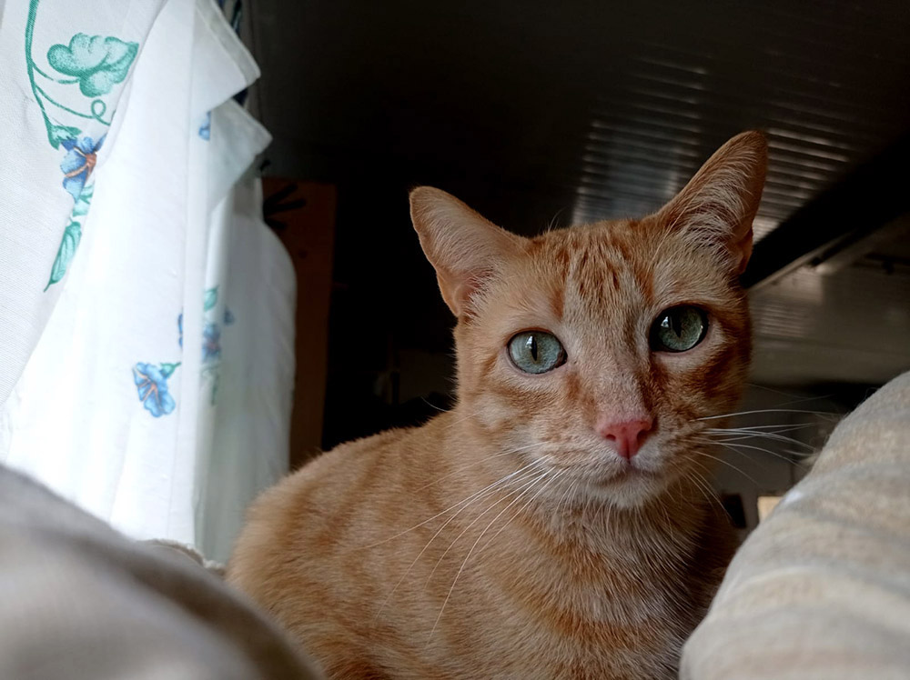 Al heel gauw voelde hij zich daar thuis. Hij bleek een super sociale en aanhankelijke kat te zijn. Hij sloot vriendschap met alle medewerkers en huisgenootjes. Wat heel grappig is, is dat hij vaak een plekje kiest waar hij iedereen in de gaten kan houden. Liefst een beetje hoog. Als er een medewerker voorbijloopt tikt hij ze graag even op hun schouder of hoofd.