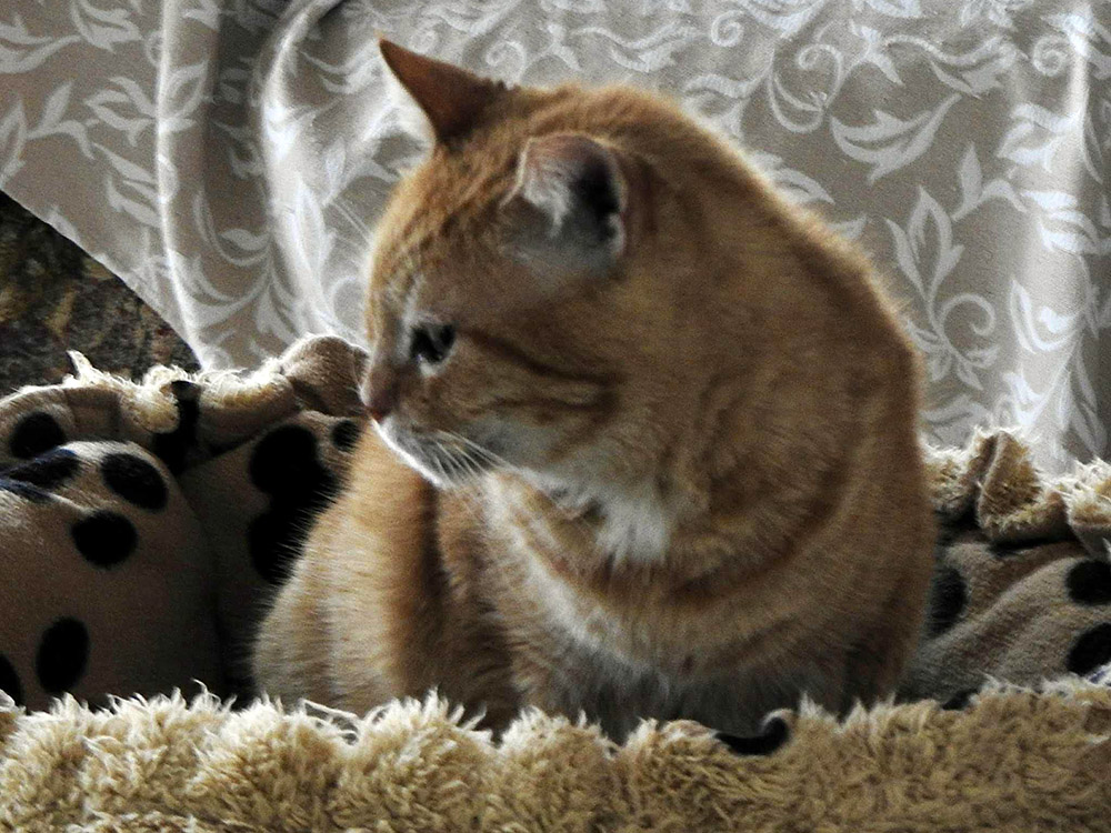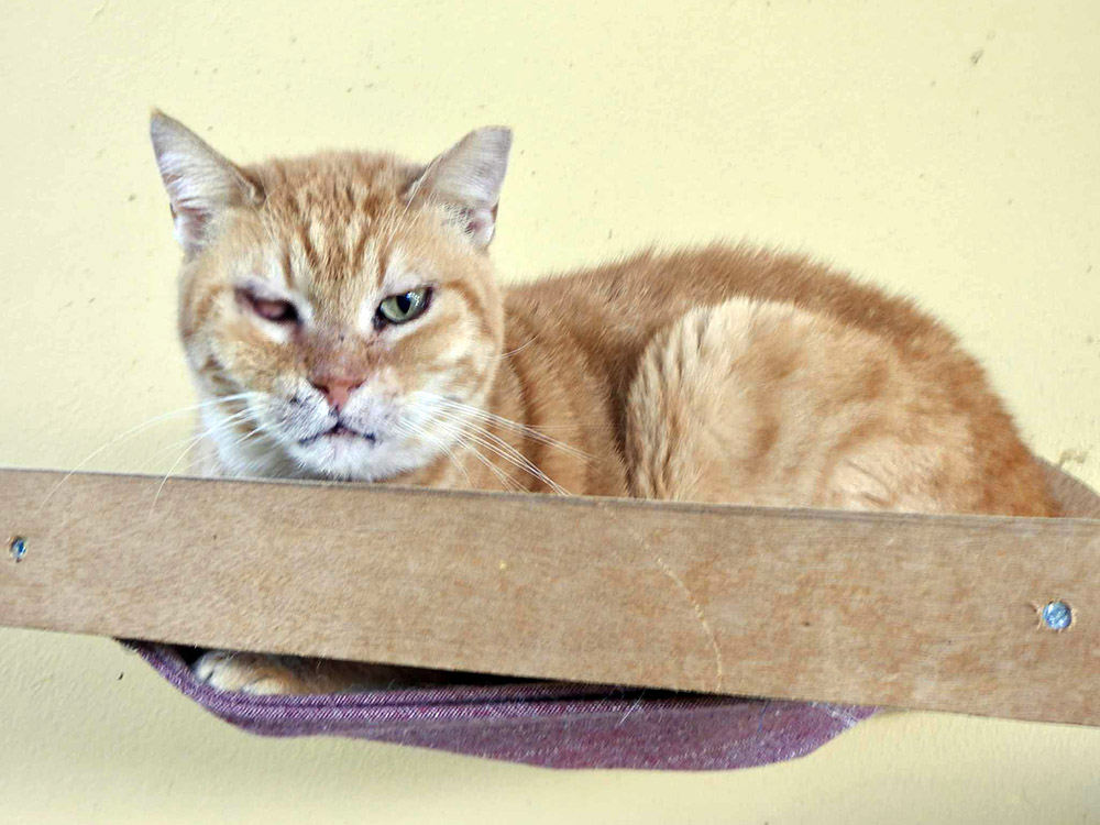 Het leven op straat was zwaar voor hem. Zijn gebitje en een oogje waren aangetast, hij had huidproblemen en was kortademig en benauwd. Toen Marilyn dat opmerkte, nam zij hem hem mee naar de dierenarts en daar bleek al snel dat Orange op leeftijd was en dat de jaren op straat zijn tol hadden geëist. Terug naar de kolonie zou betekenen dat hij langzaam zou wegkwijnen, zonder de zorg en warmte die hij zo hard nodig heeft.