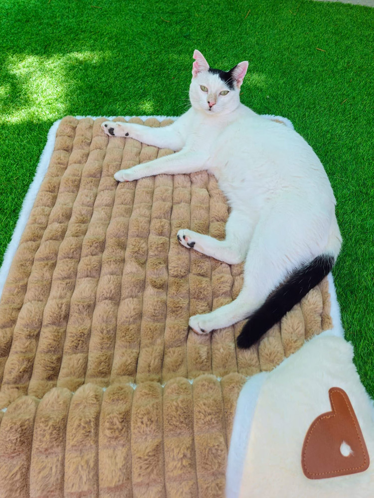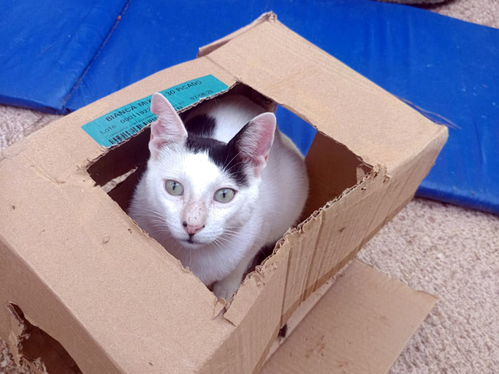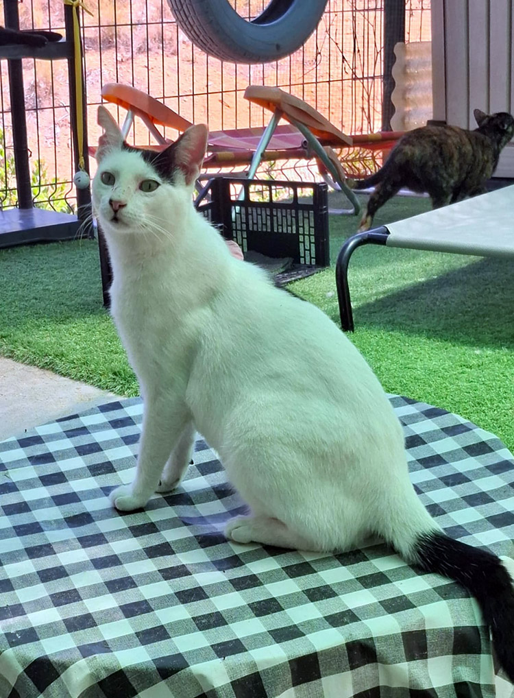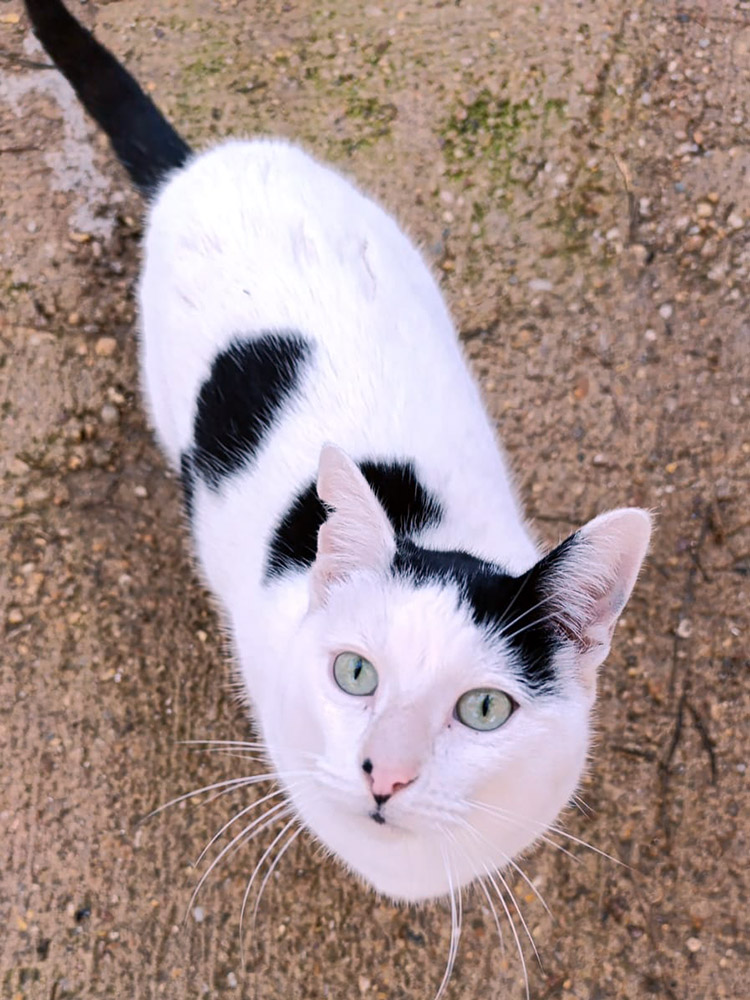 Hij verscheen voor het eerst in een kattenkolonie op het strand. De vrouw die deze kolonie verzorgt, trof hem aan terwijl hij uitgehongerd en met een lege blik aan de uiterste rand van de kolonie toe zat te kijken hoe de andere katten zaten te eten. Ze benaderde hem voorzichtig om hem wat eten te geven. Hij leek doodsbang, maar tot haar verbazing volgde hij haar daarna naar haar huis.