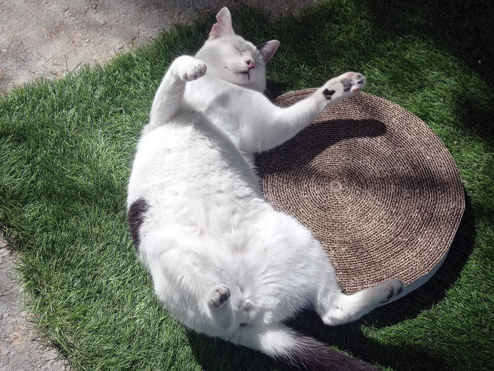 Pongo is soms ook een ondernemende kat. Hij klimt naar de hoogste verdieping van de krabpaal of ligt op de planken aan de muur. Daar overziet hij het hele verblijf en als hij uitgekeken is springt hij naar beneden om achter balletjes en speelgoedmuizen aan te ravotten. Ook een lekkere kraaktunnel is dolle pret voor hem. Is hij moegespeeld dan kan hij uitgebreid dutten, waarbij zo nu en dan een klein snurkje te horen is.