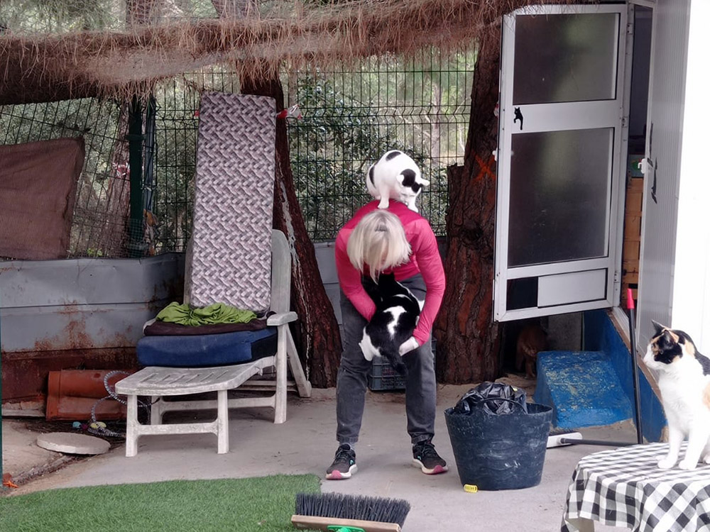 Zo ging dat een paar weken door. Elke keer na het voeren van de kolonie volgde hij haar naar huis. Toen ze hem uiteindelijk binnenliet zocht hij warmte en troost in haar armen. Dit deed vermoeden dat hij ooit een huiskat was geweest, die waarschijnlijk aan zijn lot was overgelaten.