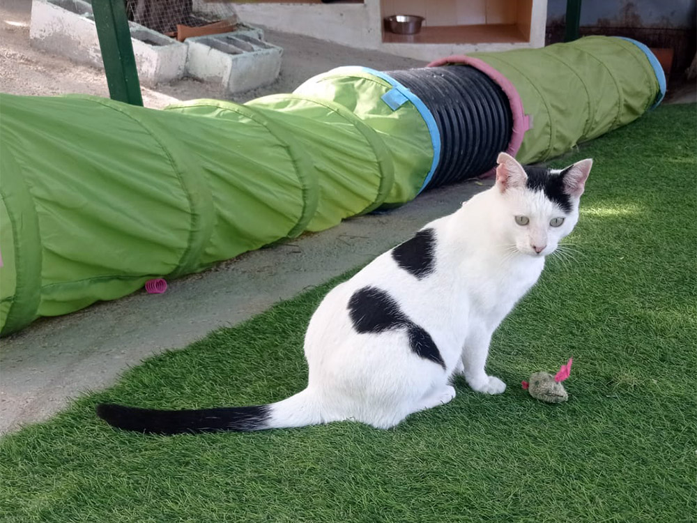Hem weer de straat opsturen was geen optie, maar gelukkig was er een plekje voor hem in het asiel. Daar paste hij zich snel aan. Hij is altijd vrolijk, aanhankelijk en graag in de buurt van de medewerkers. Als zij aan het werk zijn in het asiel klimt hij liefst op hun schouders om met zachte geluidjes of kopjes hen aan te moedigen.