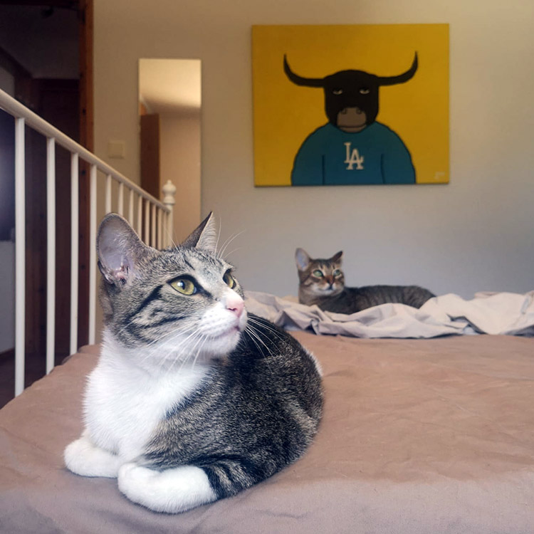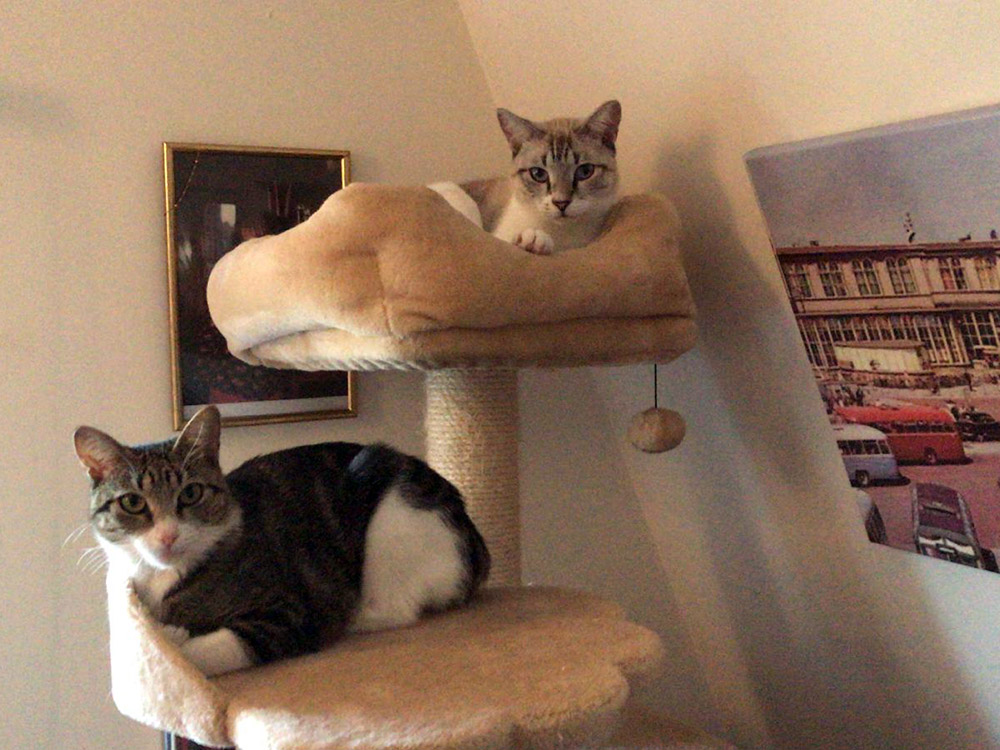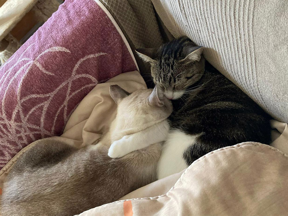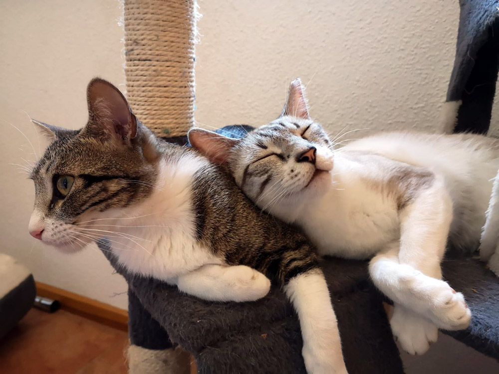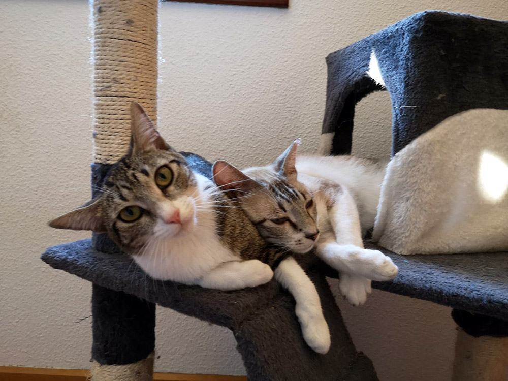 Het zijn ontzettend lieve, zachtaardige katten die heel graag samen zijn: een onafscheidelijk duo. Ze vinden het heerlijk om samen tukjes te doen en willen altijd weten wat de ander aan het doen is. Princesa is wat onafhankelijker dan Principe; ze geniet van knuffels en aandacht maar ze vindt het ook fijn om momentjes voor zichzelf te hebben. Principe is een echt moederskindje en wil eigenlijk altijd gezellig bij zijn mensenfamilie of Princesa in de buurt zijn. Een spelletje vinden ze leuk, maar het hoeft niet heel lang te duren. Een muisje aan een hengeltje is een groot plezier maar daarna is het weer chillen geblazen. Ze zijn gek op hun krabpaal met plateautjes en hokjes; daar kun je ze eigenlijk altijd vinden. Ze doen er samen dutjes op of kijken uit het raam. Princesa kun je een plezier doen door videootjes met vogels of Tom & Jerry op Youtube aan te zetten. Principe helpt graag een handje in het huishouden: pak een bezem en hij is helemaal gelukkig. Slapen doen ze het liefst met hun mensenfamilie, lekker knus op of naast het bed.